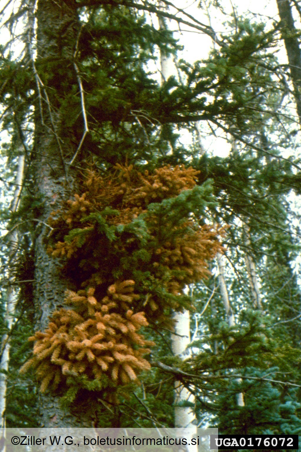 Naziv: Smrekov metličasti rak Opis: Metličasti poganjki na smreki v začetku poletja, ko že dobivajo značilno rumeno-oranžno barvo zaradi prisotnosti ecijev Avtor slike: Ziller W.G. Datum zajetja slike: 30.09.2025