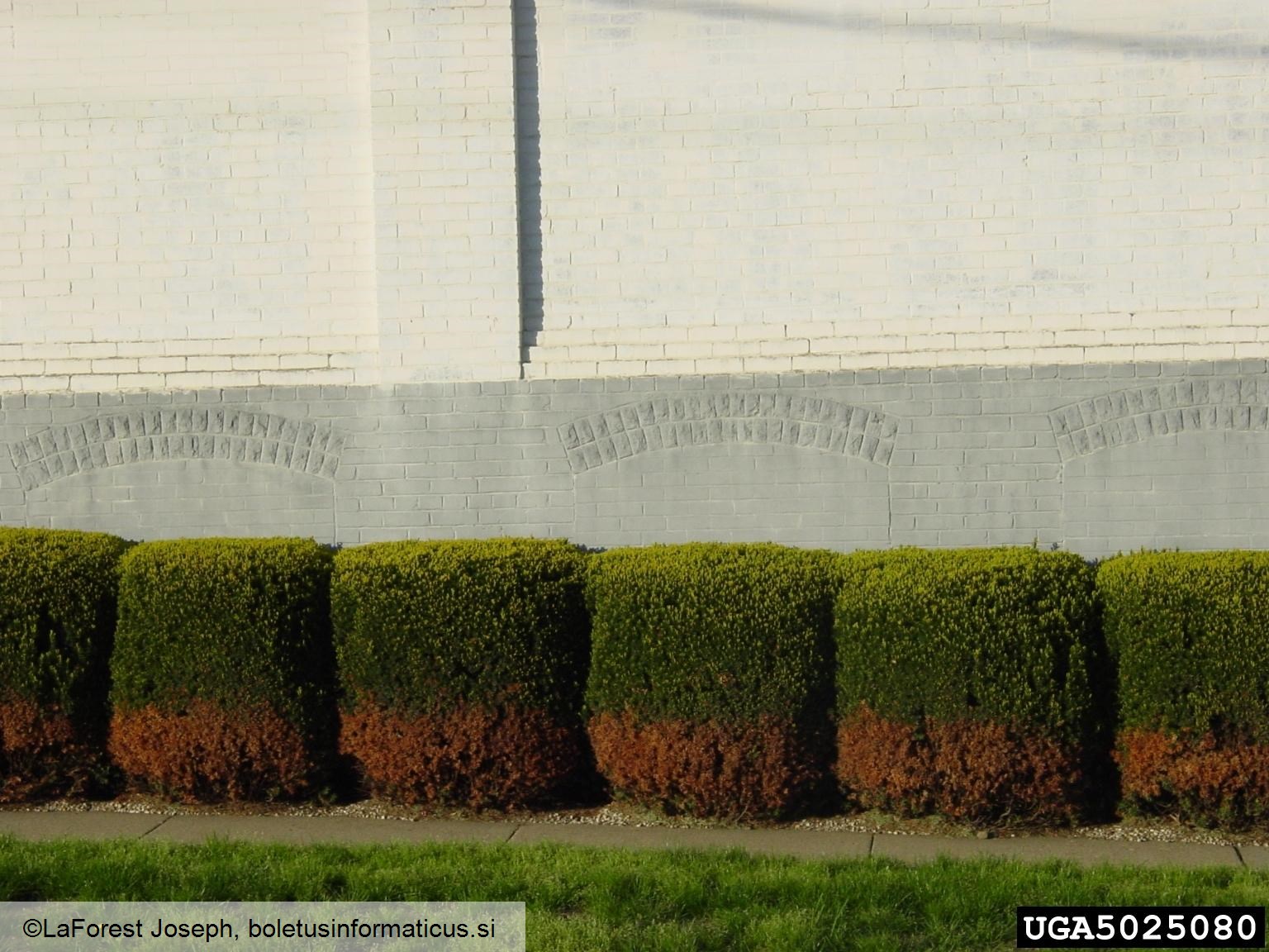 Naziv: Sol na Taxus spp. Opis: simptom, na tisi, poškodba zaradi soli Avtor slike: LaForest Joseph Datum zajetja slike: 06.01.2011 Lokacija: Združene države Amerike