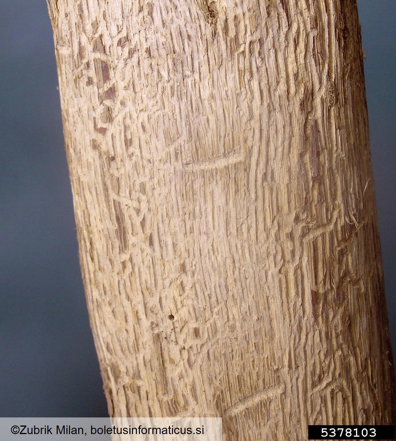 Naziv: hrastov beljavar (Scolytus intricatus) na Quercus spp. Opis: rovi, na hrastu Avtor slike: Zubrik Milan
